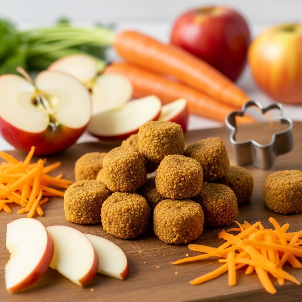 These baked treats combine the goodness of apples and carrots into a crunchy biscuit. They’re perfect for a satisfying chew.