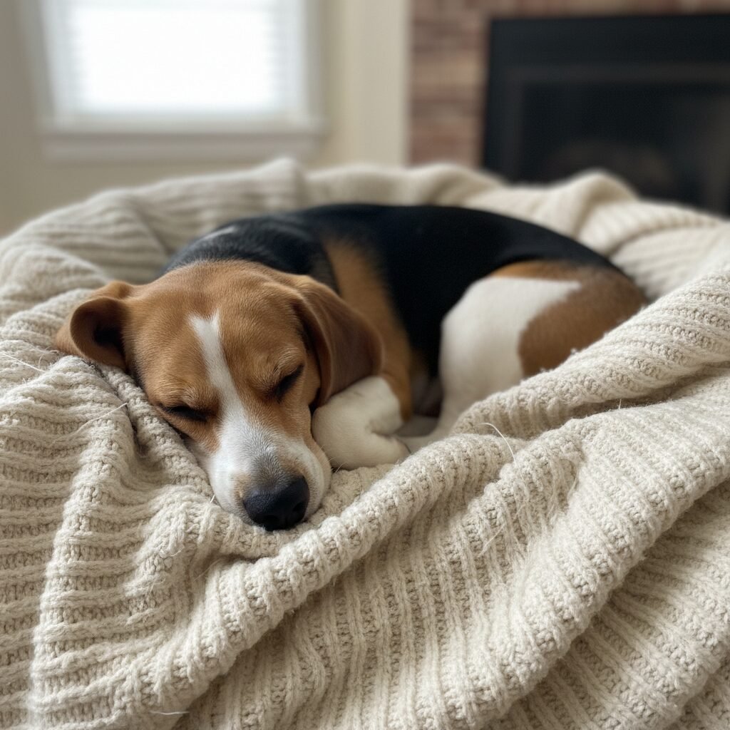 For those moments when you need a touch of calm, this wallpaper features a Beagle sound asleep, curled into a perfect ball. It embodies peace and comfort, reminding you of those quiet, loving moments with your own furry friend.