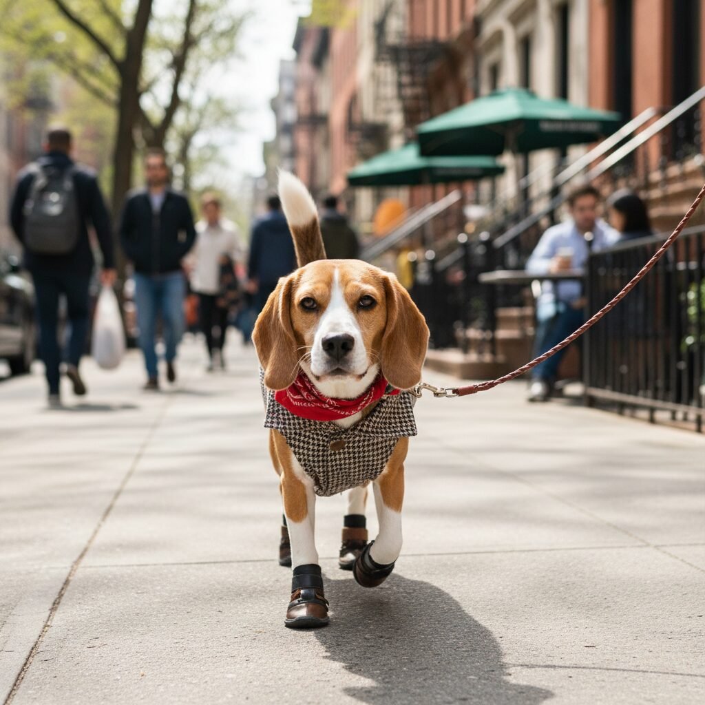 Even in the urban jungle, Beagles bring their charm. This image shows a confident Beagle strolling down a city sidewalk, perhaps on its way to a new adventure. It’s a chic and modern take on Beagle life.