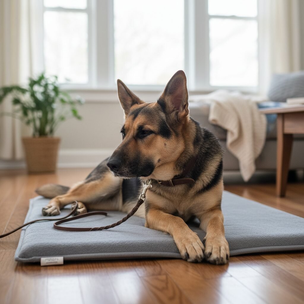 - ‘Place’ or ‘Mat’ Training Teach your Shepherd to go to a specific spot (a mat or bed) and stay there calmly until released. Start with short durations and gradually increase.