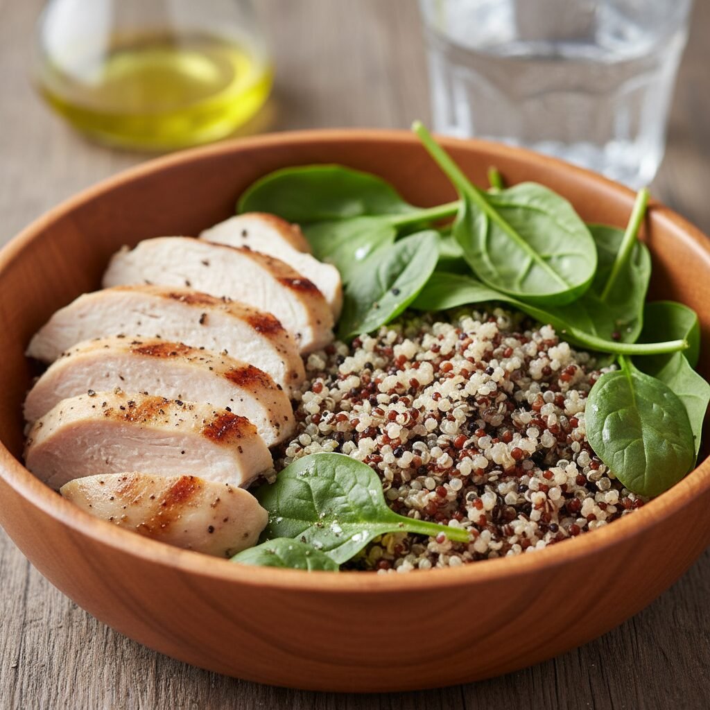 - Mix shredded chicken, cooked quinoa, and spinach together.