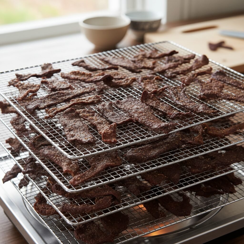 - Bake for 2-3 hours, flipping halfway, until the strips are dry and chewy but not brittle.