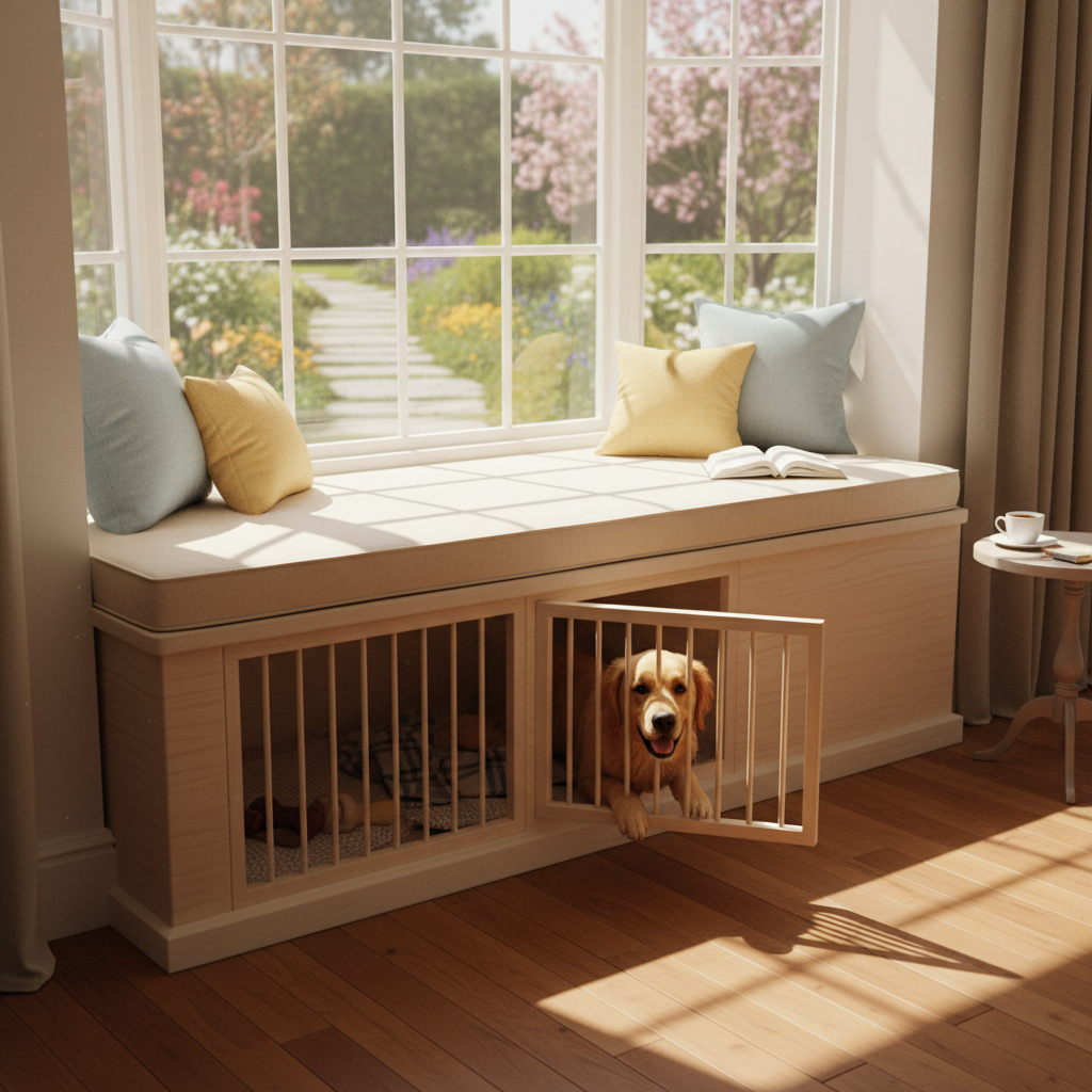 Imagine your dog enjoying the sun while lounging in their crate, which is cleverly built into a window seat! This adds charm to any room and provides a comfortable spot for both humans and canines. Ensure the window seat is stable and the crate has good ventilation, especially on sunny days.