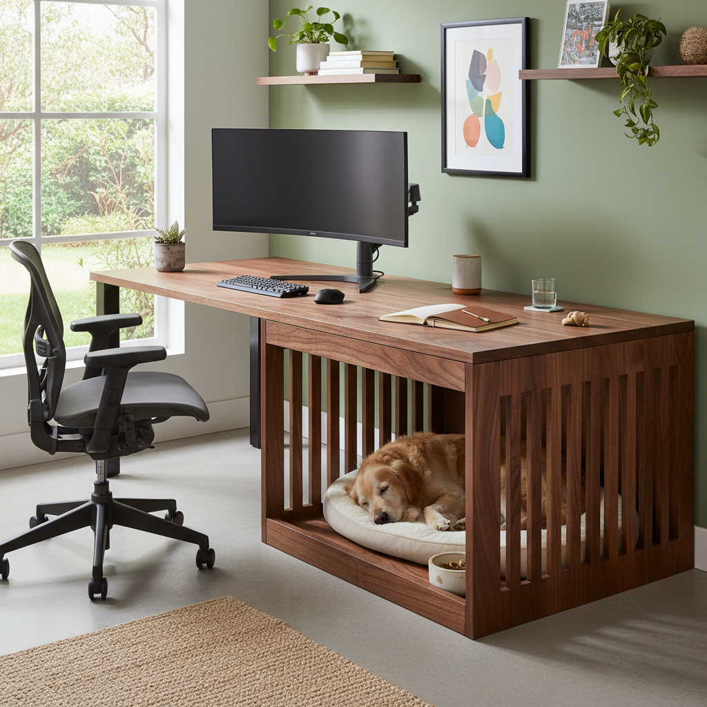 Working from home often means your dog wants to be close. A desk extension dog crate allows your pup to nap comfortably under your workspace. You can build a simple, sturdy extension to your existing desk or create a new desk that incorporates the crate as part of its base. It’s perfect for small home offices.