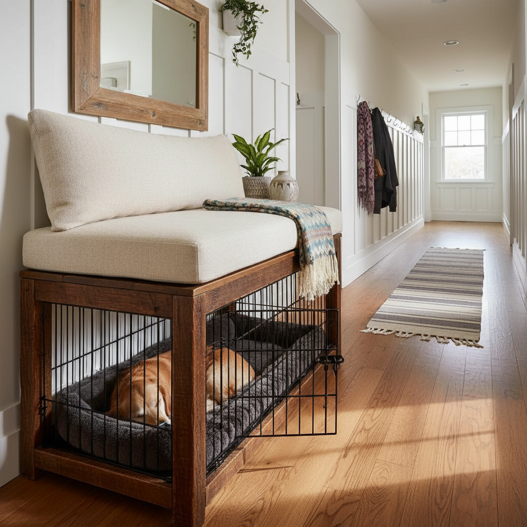 A bench with an integrated dog crate is a fantastic addition to entryways, mudrooms, or even dining areas. It provides extra seating and a convenient spot for your dog. You can build a simple wooden bench frame that encases the crate, adding a padded cushion on top for comfort. It’s practical for putting on shoes or a spot to relax.