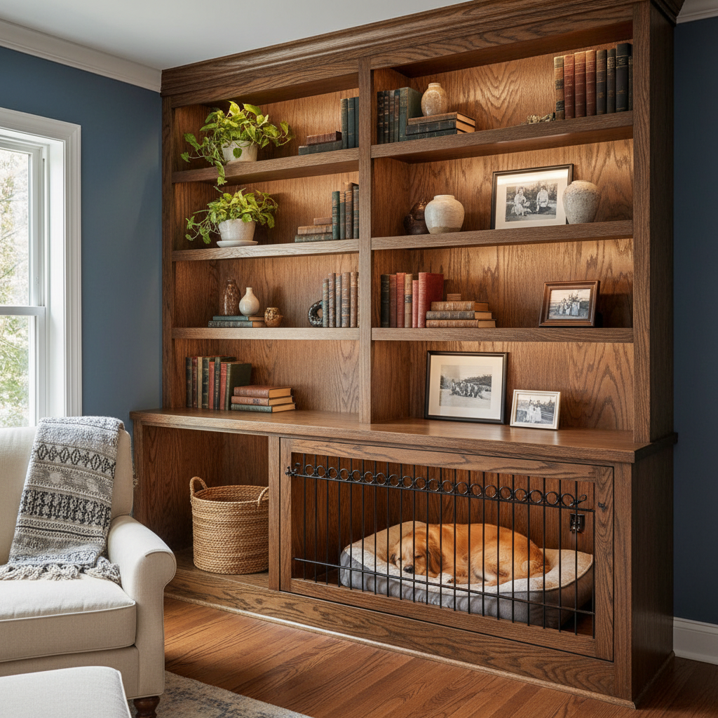 For those with a knack for carpentry, a built-in shelf system can incorporate a dog crate beautifully. This works well in a den or office. The crate becomes the bottom section of a custom shelving unit, providing both storage for books and decor, and a dedicated den for your dog. This makes the crate feel like an intentional part of the home’s architecture.