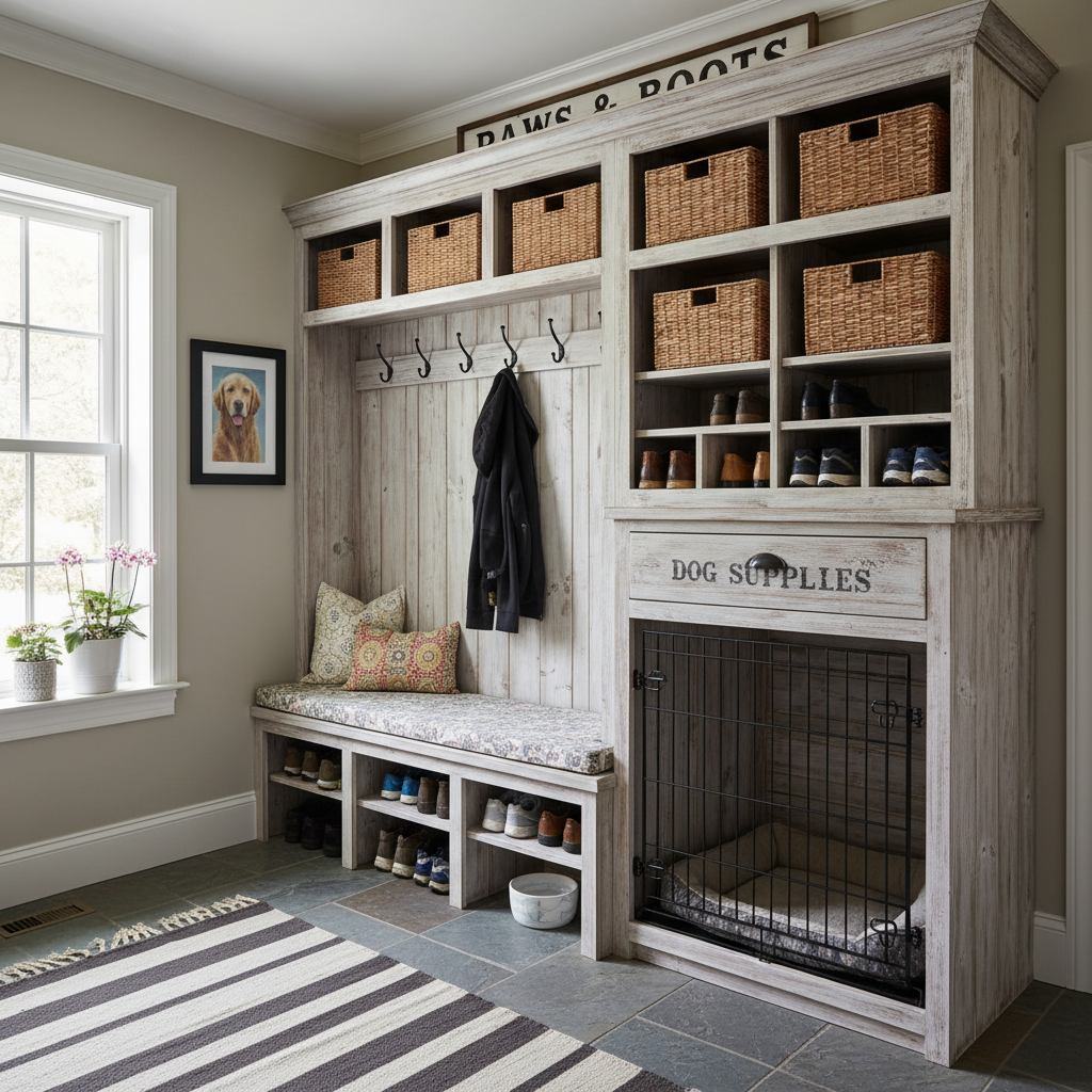 Mudrooms are all about organization and utility. A custom mudroom storage unit can include cubbies for shoes, hooks for coats, and a perfectly sized spot for your dog’s crate. This keeps all your outdoor gear tidy and gives your dog a designated, easy-to-clean area right by the door.