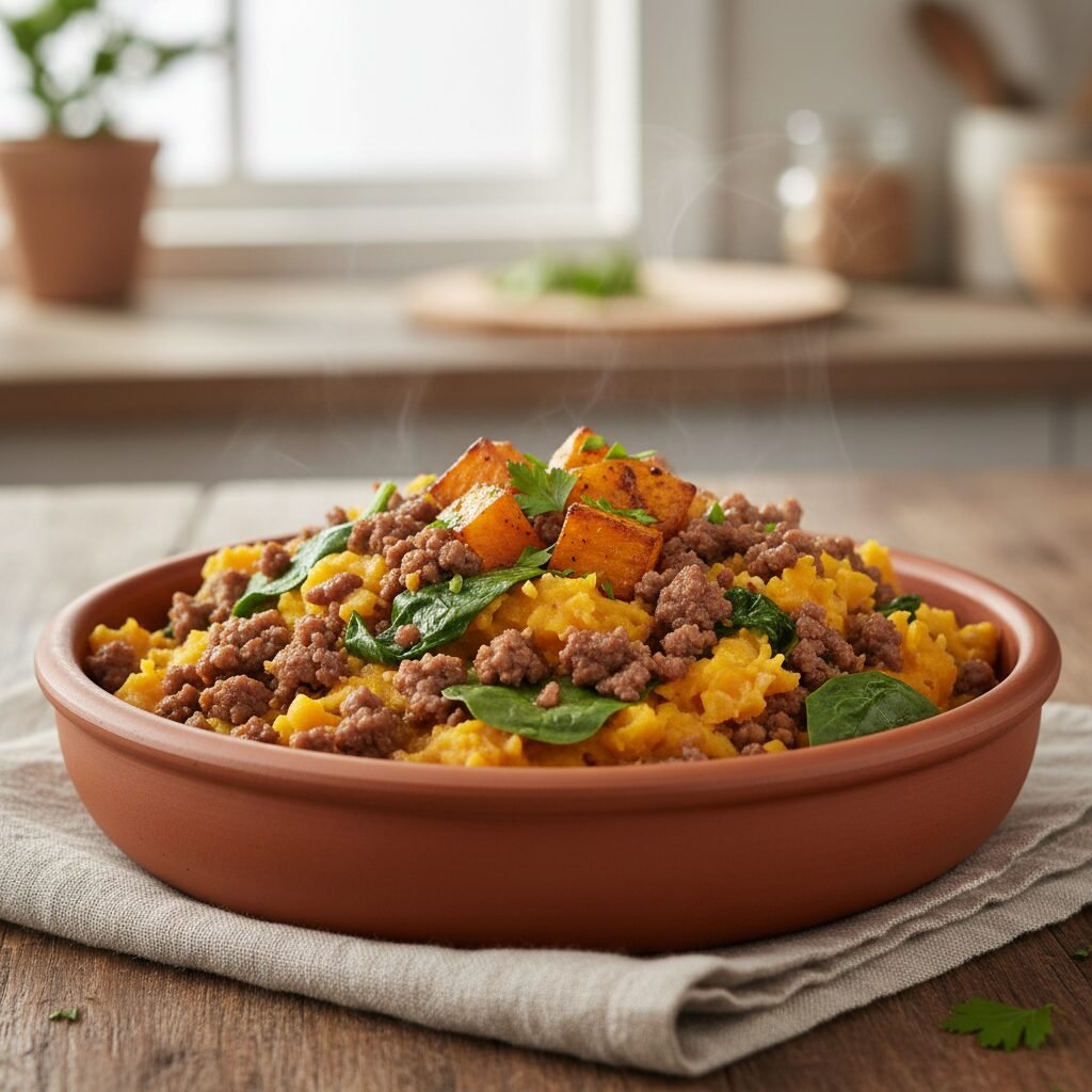 - Combine the cooked beef, mashed sweet potato, and spinach.