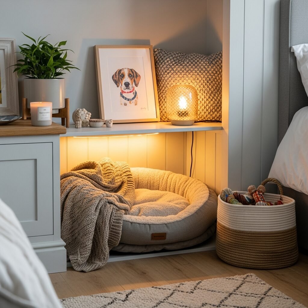 Install a small, dimmable lamp or a string of fairy lights to create a soft, calming ambiance in your dog’s personal space.