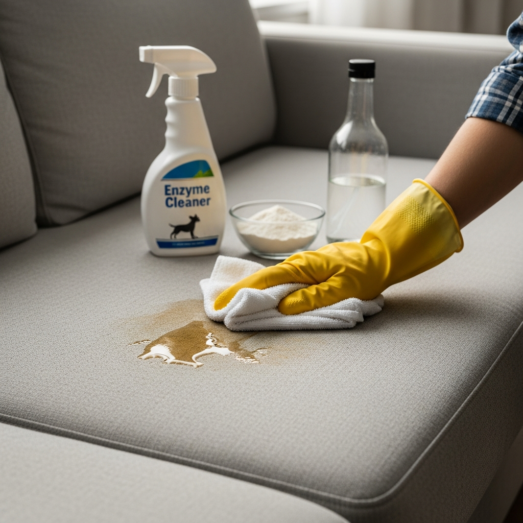 White vinegar’s acetic acid neutralizes the ammonia in dog urine, which is responsible for much of the strong smell. Baking soda is a natural absorbent and deodorizer that pulls moisture and odors out of the fabric as it dries. Together, they form a powerful, non-toxic cleaning duo.