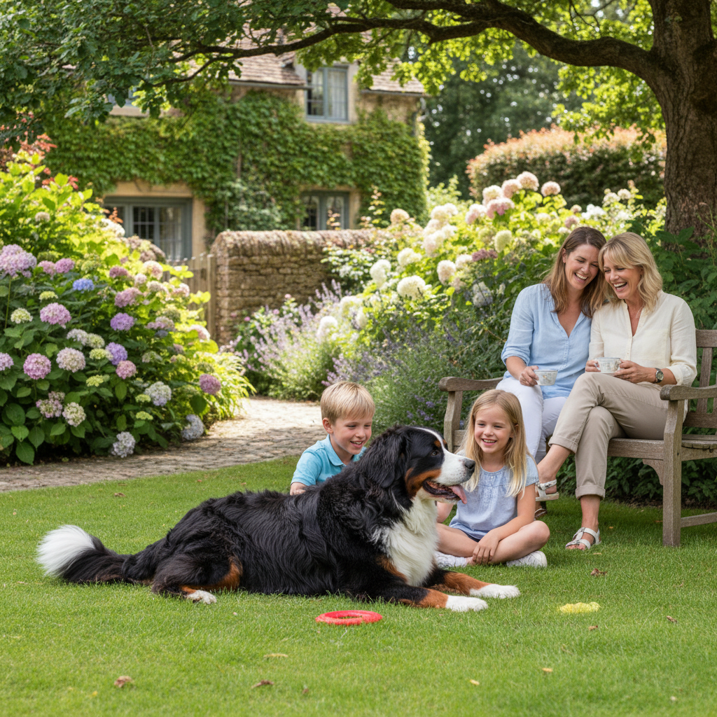 Bernese Mountain Dogs are known for their striking appearance and sweet, gentle disposition. Bred for farm work in the Swiss Alps, they are strong and intelligent. Berners are exceptionally good with children and other pets, forming strong bonds with their families. While not aggressive, their size and watchful nature make them excellent natural deterrents and loyal protectors.