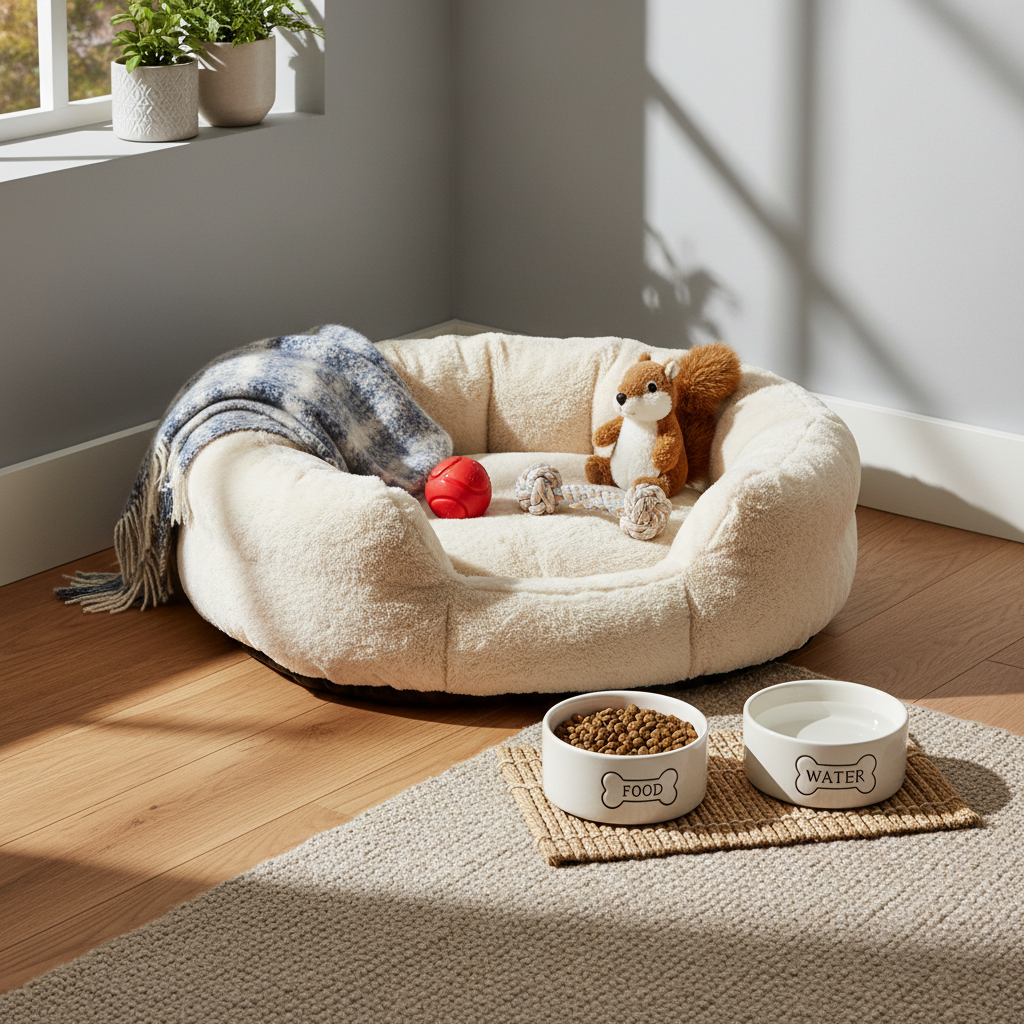 - Dog Bed or Crate A comfortable, secure place for them to sleep and feel safe.