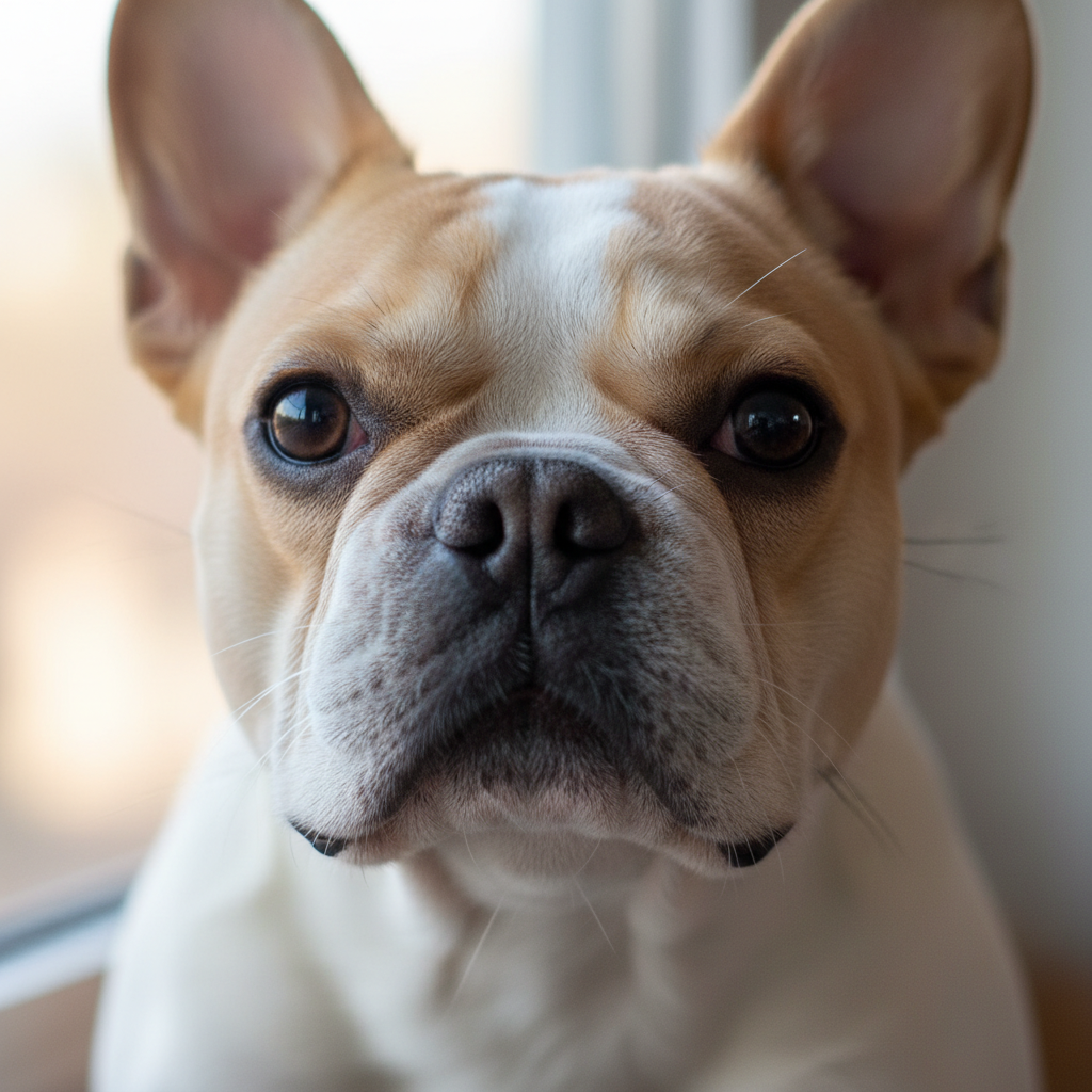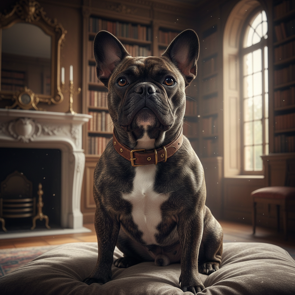 Showcasing the sophisticated side of the breed, this portrait features a Frenchie with an air of calm confidence. A truly elegant choice for any dog parent.