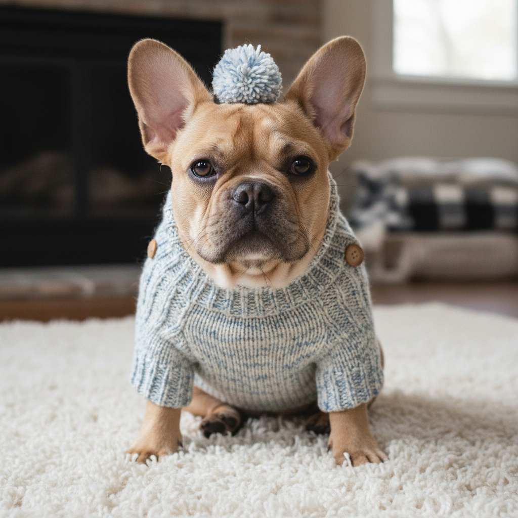 Embrace the cozy vibes with this charming Frenchie sporting a fashionable sweater. It’s a heartwarming image that reminds you of winter snuggles.