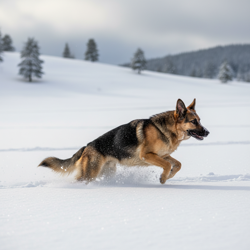 - Snow Play A German Shepherd with a snow-dusted nose, playfully digging or running through fresh powder.