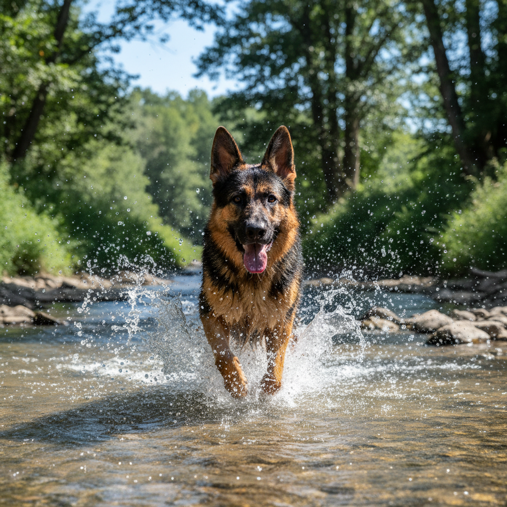 - Dynamic Leap A German Shepherd mid-air, gracefully jumping over an obstacle or through a stream.