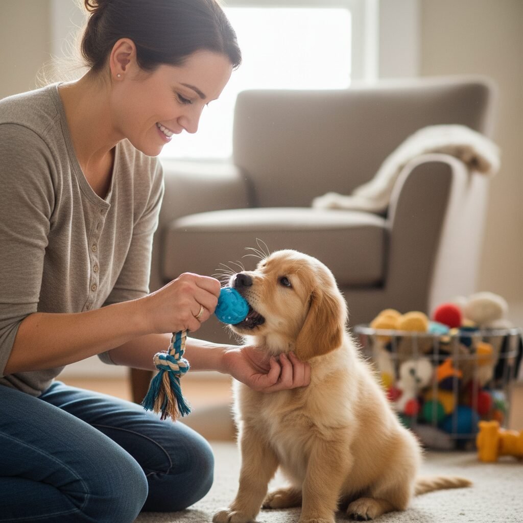 Puppy nipping is normal, but it needs to be managed. When your Golden nips too hard, let out a sharp yelp (like a puppy would), then immediately withdraw your attention. Redirect their chewing to appropriate toys. This teaches bite inhibition and what is acceptable to chew.