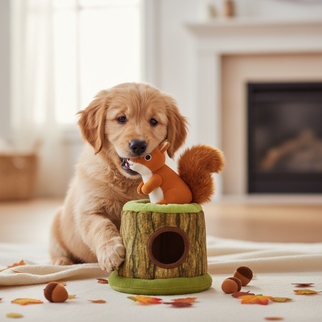 These charming toys feature a larger plush item (like a tree trunk or a barn) with smaller, squeaky plush animals hidden inside. Your dog’s goal is to pull the smaller toys out.