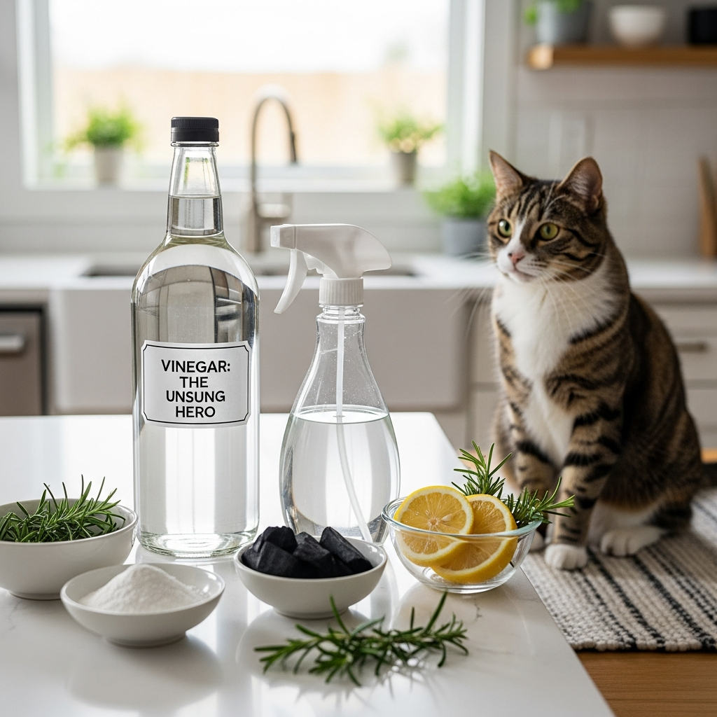 Vinegar is particularly effective at breaking down the uric acid crystals in pet urine, which are responsible for the lingering smell.