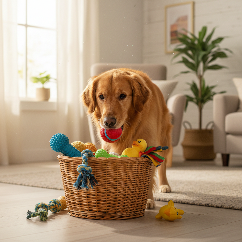 • Start with one toy and a basket Hold a toy, say ‘Clean up!’ or ‘Put away!’, and drop it into a designated toy basket. Praise your dog.