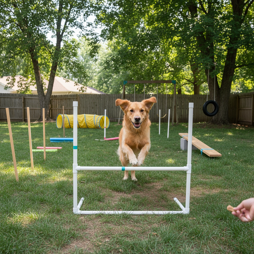 • Set up simple obstacles Use blankets draped over chairs for tunnels, broomsticks balanced on books for jumps, or hula hoops for your dog to jump through.