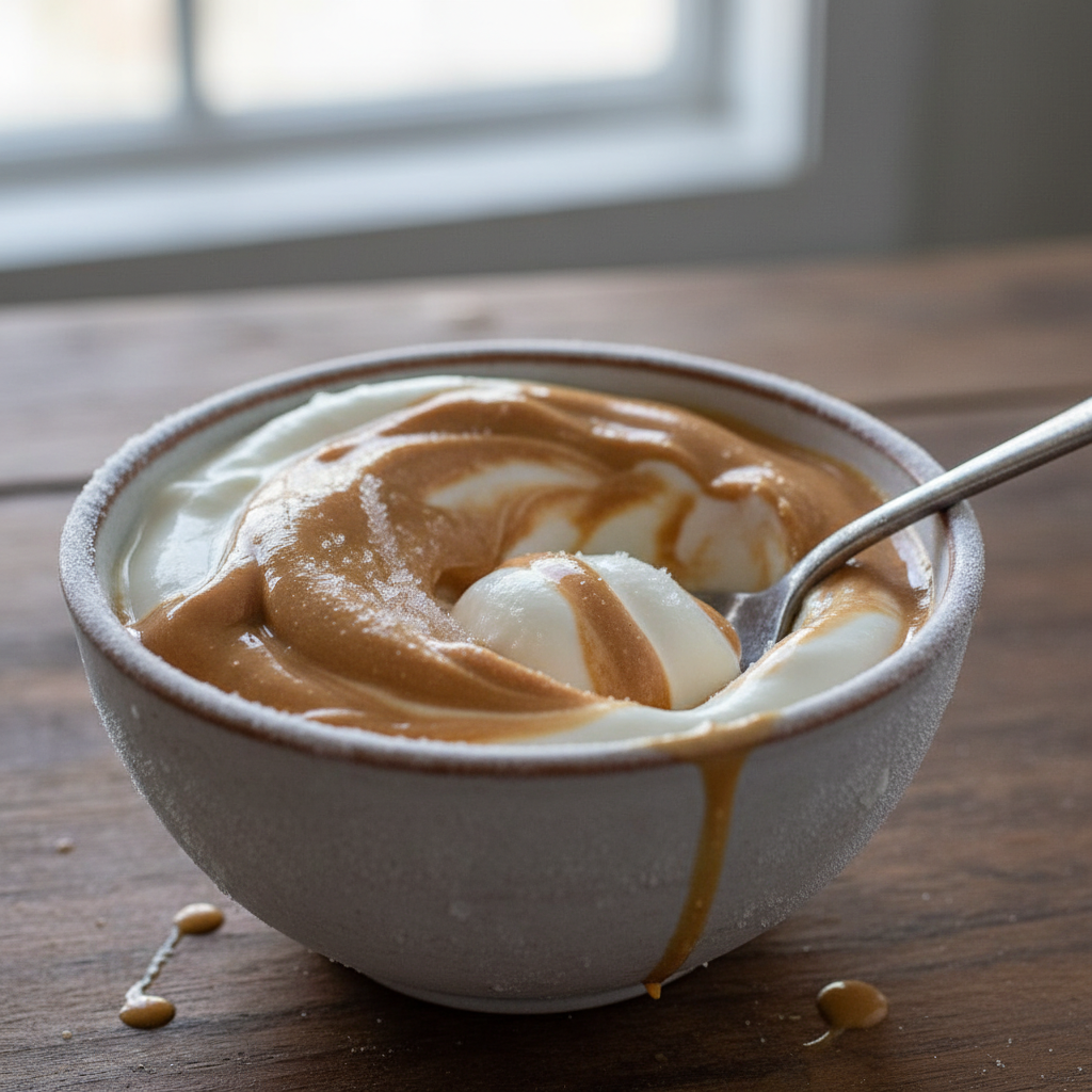 3. Using a spoon or a skewer, gently swirl the peanut butter through the yogurt to create a marbled effect.