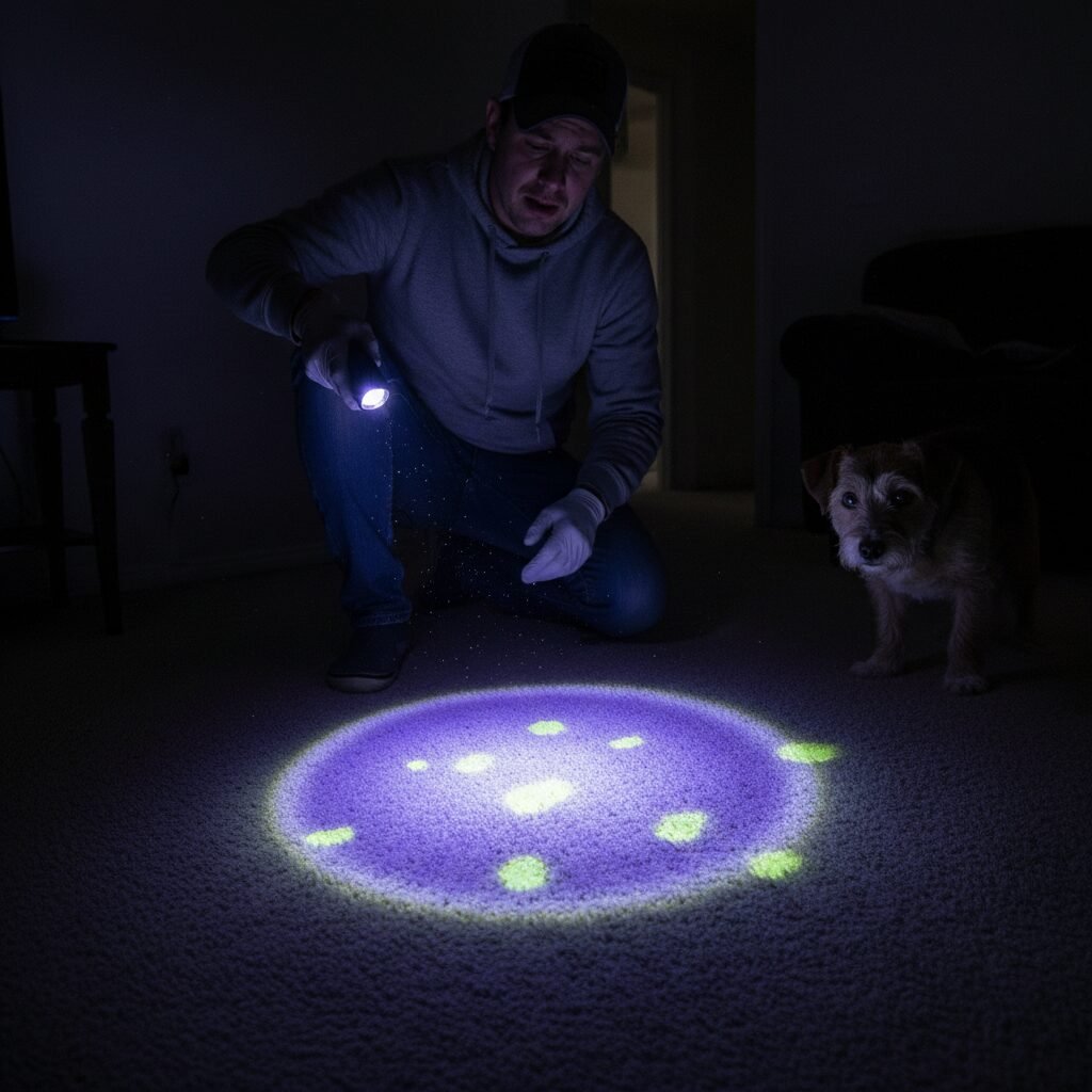 - Locate the Source Old urine stains can be invisible to the naked eye. A UV blacklight flashlight is your best friend here. In a darkened room, shine the light over suspected areas – dried urine will glow a dull yellow or green. Mark these spots with chalk or tape.
