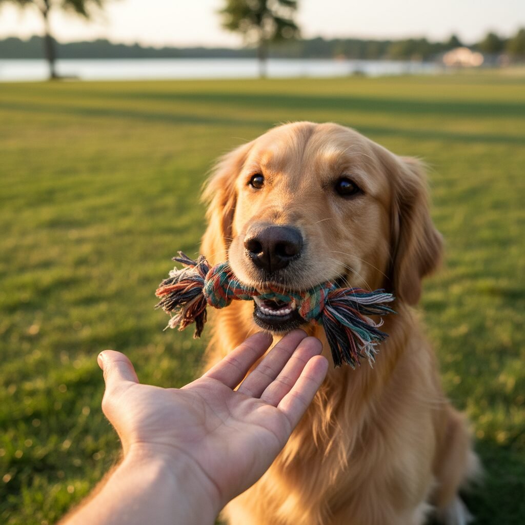 Retrievers love to carry things, but sometimes they pick up items they shouldn’t or need to release a toy during play. “Drop it” ensures they safely relinquish objects.