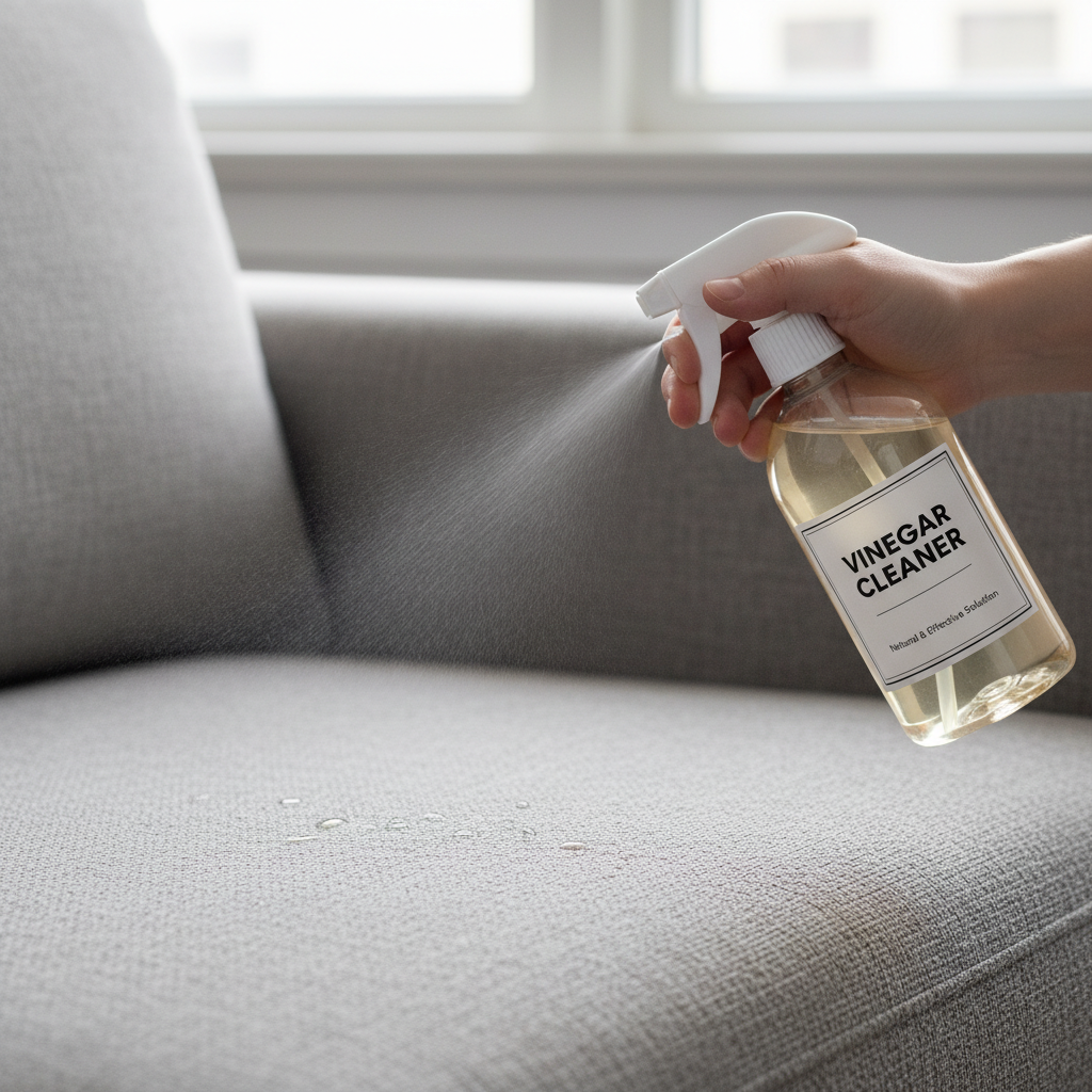 - Saturate the Area Lightly spray the affected area with the vinegar solution. Don’t over-saturate, especially if your sofa has delicate padding.